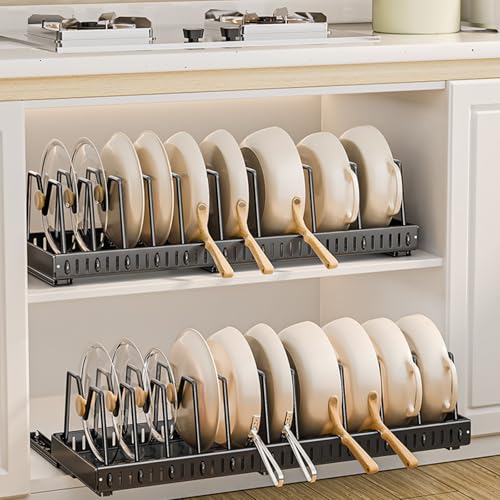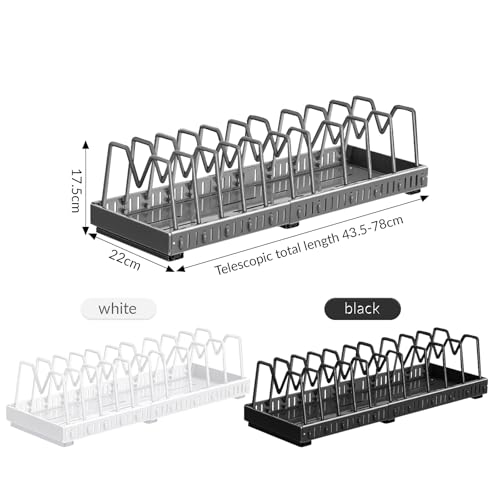 1 Pack Steel Under Cabinet Pull Out Pot Lid Organizer with 11 Adjustable Dividers – Pan Pot Lid Holder Organizer Rack Telescopic Total Length 43.5-78cm (black)
