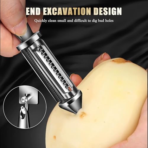 • ✅【Unique Design】: The Stainless Steel Peeler adopts a serrated blade design, which is not easy to slip during use, and has multiple functions, making it easy to peel or shred, and Built-in potato-eye remover, The handle is round and integrated, providing a comfortable grip and effortless use.