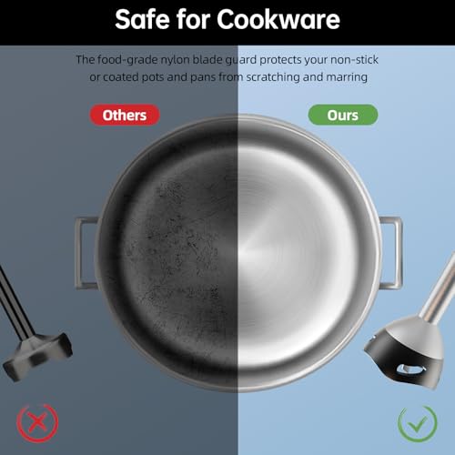 - NO MORE SCRATCHES ON YOUR CONTAINERS – Unlike other bargain brands, this hand blender has an upgraded blade guard to prevent scratches and damage to your pots, pans and other containers. The unique bell-shaped guard also prevents splashing and ensures impeccable cooking.