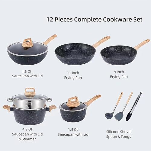 12-Piece Induction Cookware Set, Medical Stone Cookware Set with Lid, Non-Stick Ideal for Cooking, Roasting and Baking (Black)