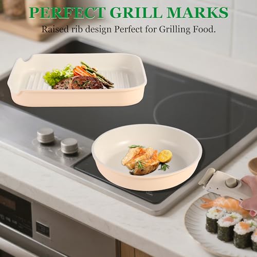 - Pot and Pan Sets:The saucepan sets features a 20cm milk pan,for warming milk, making delicate custards,or simmering small amounts of sauces.The 20cm frying pan is for cooking eggs,pancakes,and breakfast,the 26cm frying pan offers more surface area for larger scale frying tasks.The 26cm square baking pan is great for baking brownies, roasting vegetables, or making one pan casseroles.a 20cm notched glass lid that provides a clear view of the cooking process and fits snugly on the 20cm pans.