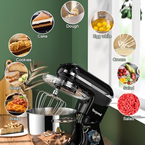- 【Splash Guard & Multiple Accessories】: Enjoy mess-free cooking with the splash guard feature that keeps your kitchen tidy while adding ingredients. This stainless steel food mixer comes with a 5.5L bowl, dough hook, whisk, beater, and meat grinder accessories, making it ideal for diverse food preparations