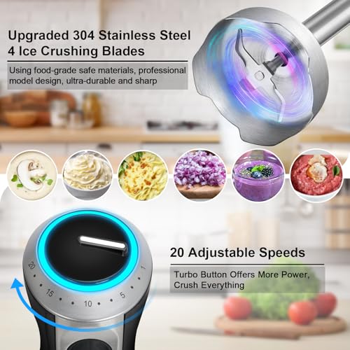 - [20 Speed Control and Turbo Mode] The stainless steel immersion blender is equipped with 20 adjustable speeds and TRUBO button. You can adjust the speed from low to high by rotating the dial on the top of the blender according to your ingredients and preferences. When you need extra power, simply press the turbo button, which increases the mixer to its maximum speed.