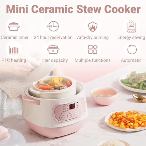 1L Slow Cooker, Mini Smart Ceramic Pot Soup Porridge Cooker with Lid, Electric Stew Pot Prevent Dry Burning, Time Appointment with 24H Reservation, Kitchen Appliances for Cooking