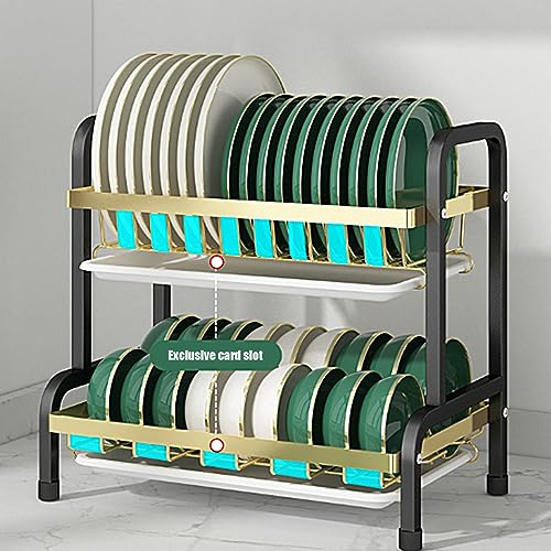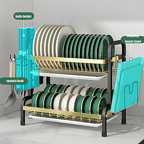 2-Tier Dish Drainer Rack with Drip Tray & Cutting Board Holder Kitchen Sink Drying Rack Space-Saving Counter (Golden Green)