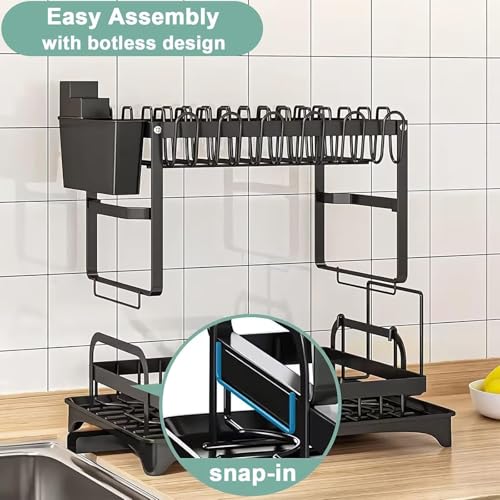 2 Tier Dish Drying Rack with Cutlery Holder and 360° Swivel Drain Spout Compact Kitchen Counter Dish Drainer for Cups Knives Spoons Forks Detachable and Space Saving (Black)
