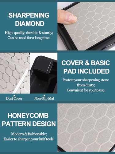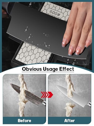 - 4 Different Grits Sharpening: You will receive 2 pieces whetstone in 4 different sides, 400# & 600# side for grit coarse sharpening and 1000# & 1200# side for grit fine sharpening. The unique honeycomb design ensures that the dust generated during the grinding process will not affect the sharpening.