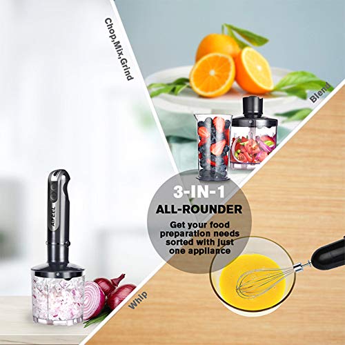 - ★ 3-in-1 Multi-functional Hand Blender: with detachable SUS blending shaft with SUS blades, 500ML chopper, 600ML measuring cup and SUS egg whisk.