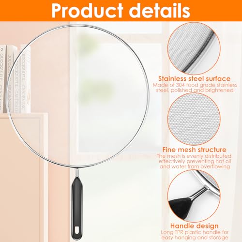 - 🍳【High-Quality Material】This splatter guard is constructed from premium stainless steel featuring a fine mesh design. It boasts excellent heat resistance, making it ideal for prolonged use. The long TPR plastic handle is convenient for hanging and storage.