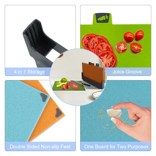 4 Colour Coded Chopping Boards Set with Non-Slip Feet – Dishwasher Safe Kitchen Essentials for Vegetables, Meat & Fish | Wheat Straw Reversible Cutting Board Set with Stand