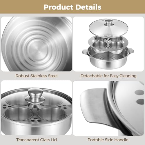 4-Cup Egg Poacher Pan, Stainless Steel Steamer Pot for Induction & Stovetop, 9.4×2.6 in, Even Heat Distribution, Ideal for Soup & Boiled Eggs