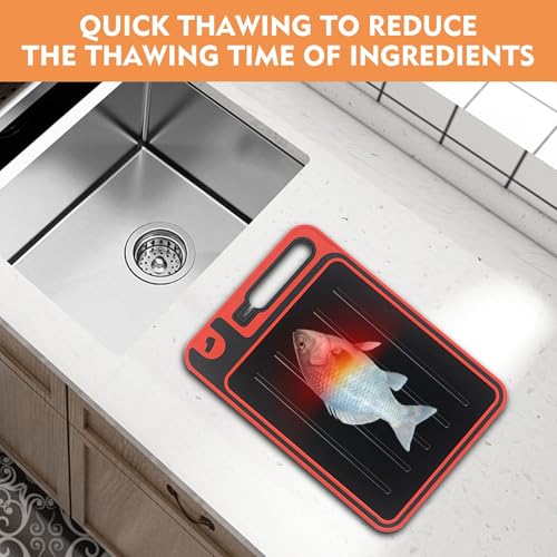 4-in-1 Miracle Melt Defrosting Board: Double-Sided Chopping Board with Grater, Sharpener & Defrost Tray for Meat, Fish, and Food (Red)