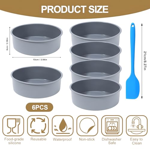 4 Inch Silicone Cake Tins for Baking, 6 Pack Small Round Baking Moulds Silicone Muffin Baking Tray With Scraper, Nonstick & Quick Release 10 cm Cupcake Baking Pan for Muffin, Mousse Bread (Grey)