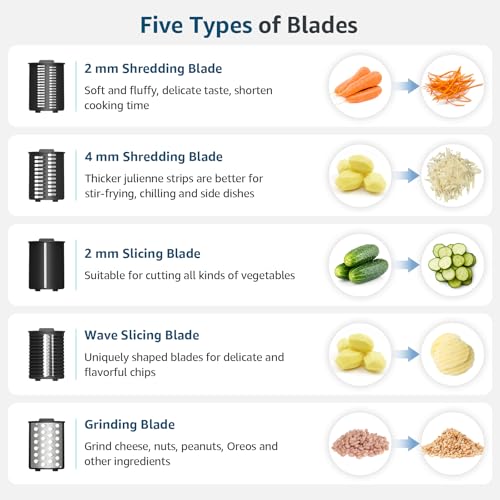 - 5 in 1 Electric Cheese Grater – The electric cheese grater comes with 5 interchangeable stainless steel blades: slicing blade, wavy slicing blade, 2mm/4mm shredding blade, grinding blade. Whether you are slicing, shredding or grating, this cheese grater is designed to meet your different needs, allowing you to focus on creating delicious meals.
