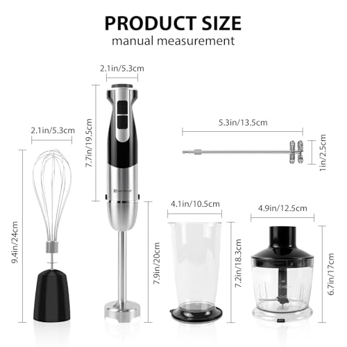 - 【5-in-1 Hand Blender】Our immersion blender handheld set Includes hand blender, egg whisk, 600ml(20oz) Beaker,500ml(17oz) food chopper bowl and milk frother. Many options are available to you: smoothies, milkshakes, juice, soups, sauces, mayonnaise, purees, baby food, and more, fulfill your various demands for delicious foods.