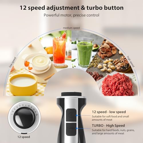 - 【12 Speed Adjustable & Turbo Mode】Designed with a 12 speed control dial and turbo button. You can easily adjust the speed and power according to different foods, will meet your multiple needs to make smoothies,soups,whip cream,and much more. You can freely choose the best mode as you need according to the type of food, DIY your own perfect scheme.