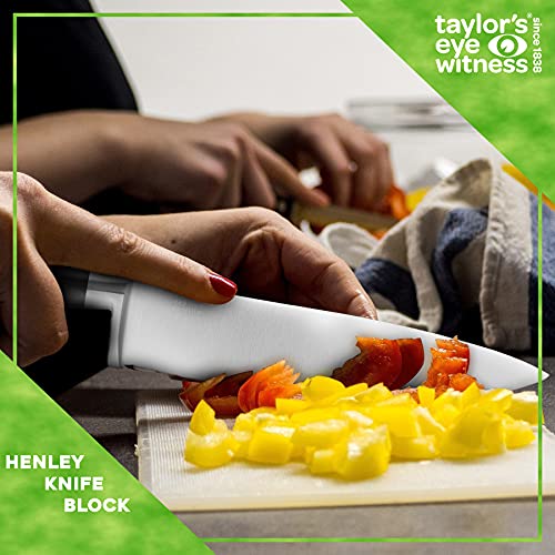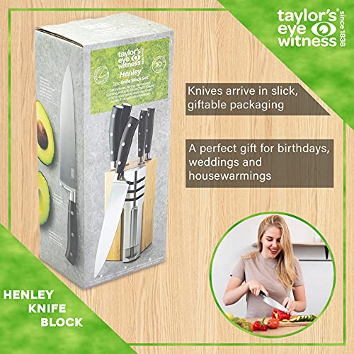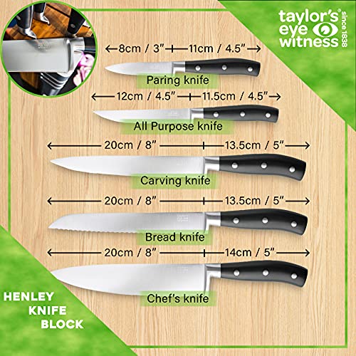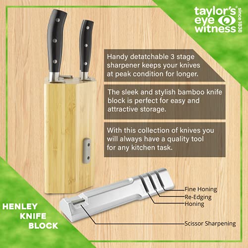 5pc Kitchen Knife Block Set – Henley by Taylors Eye Witness Stainless Steel Knives & Bamboo Wood Holder, Paring, All Purpose, Carving, Bread & Chefs Knives with 3-Stage Sharpener. 10 Year Guarantee