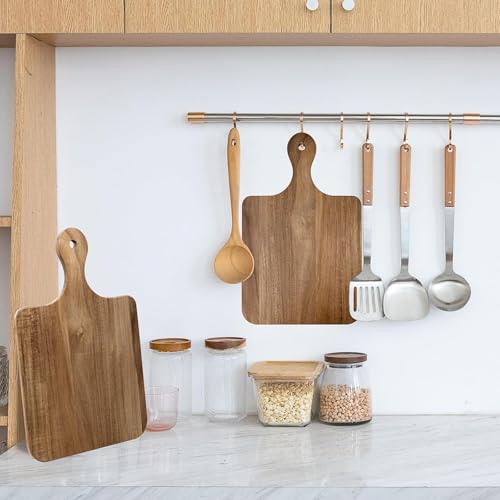- Ergonomic Handle: The large acacia wood cutting board is designed with a non-slip wooden handle, makes it easy to grip and deliver food. With a hole for hanging above the handle, you can also hang it on most places to save space in the cupboard