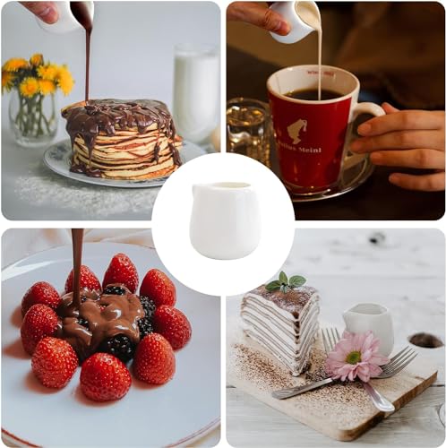 - MATERIAL CERAMIC CREAM JUG:The coffee milk jug is perfect for serving cream and milk in every coffee and tea service,high temperature resistant with excellent durability;ELEGANT DESIGN:milk jug ceramic has an anti-drip spout to keep the table clean.The small white handle-less creamer jug has a simple and generous shape that can be easily matched with other tableware.