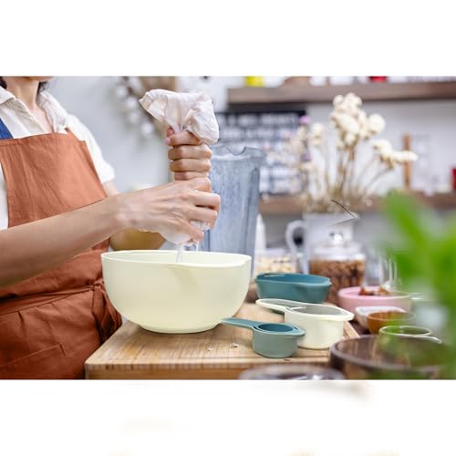 • [Safe and Reliable]: This mixing bowl and measuring cup set are made of durable plastic, non-toxic and BPA free, nonporous, easy to clean, all pieces except for the sieve are dishwasher-safe.( The nylon sieve should be hand-washed.)