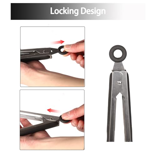 - Practical Design: The locking clip ensures easy storage and prevents accidental openings. The hanging ring allows for easy storage and space-saving when not in use. Each tong is equipped with dual built-in stands, preventing the silicone tips from touching the table surface.