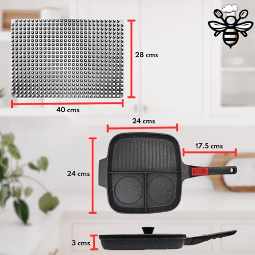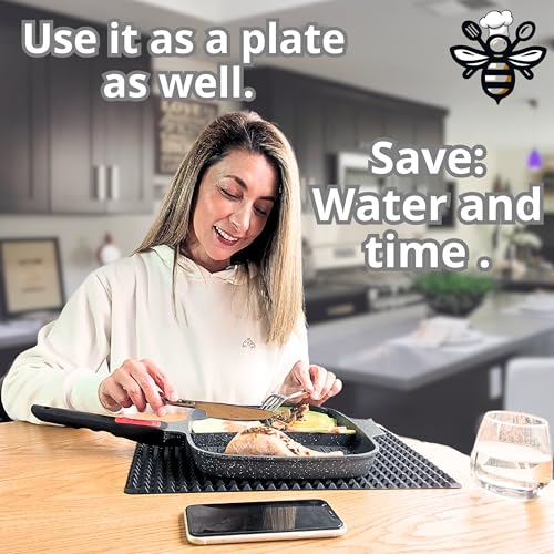- Versatility in the kitchen: with our non-stick frying pan, making delicious pancakes, eggs or crepes becomes a breeze! Ideal for breakfast or brunch with friends. Cook 3 foods simultaneously without stirring, saving time, water and energy, preparing a complete meal with just one pan.