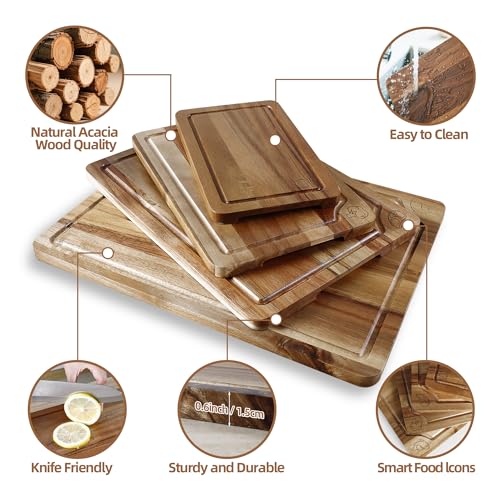 Acacia Wood Chopping Boards Set of 4 with Stand, Wooden Cutting Boards with Food Icons for Meat, Vegetables, Fruits, Cheese, Kitchen Cutting Board Set