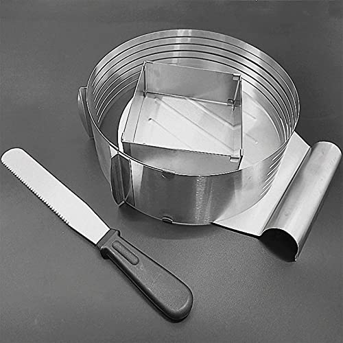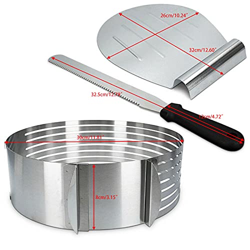 • This cake cutting aid tool set includes 4 practical tools: 2 cake rings of different sizes, 1 serrated knife and 1 pizza shovel, all made of food-grade stainless steel, safe, rust-proof and durable.
