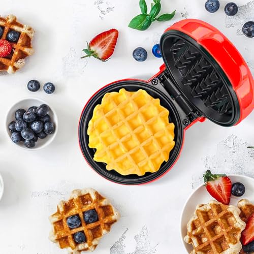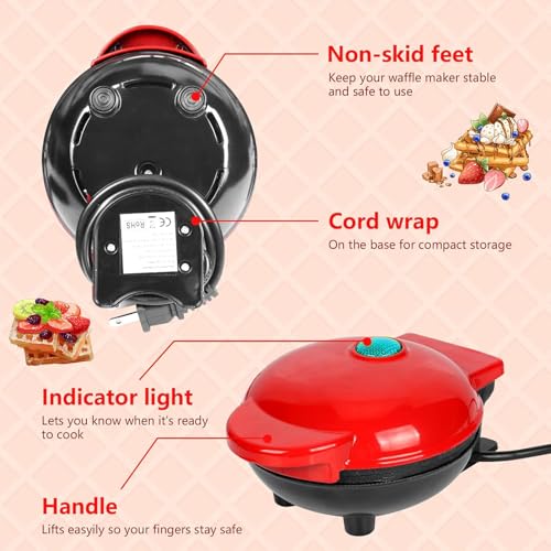 AHDXKUE Mini Waffle Maker Non-Stick Waffle Iron Machine, Mini Pancake Maker with Power/Ready Indicator Light Waffle Maker for Waffles, Sweet/Savoury Snacks Desserts, Red