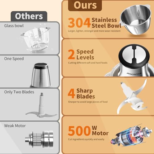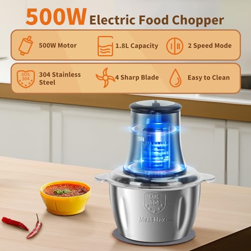 Aigostar Food Processor 500W Vegetable Chopper 1.8L Stainless Steel Bowl, Small Meat Grinder with 2 Speeds, 4 Bi-Level Blades for Fruits, Onion and Nuts,Garlic Baby Food – Flor 01H95