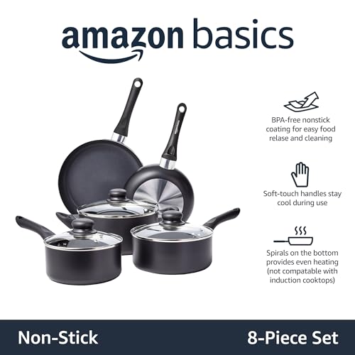 Amazon Basics 8-Piece Non-Stick Cookware Set, Black & Sabichi 36pc Day to Day White Dinner Set – Microwave & Dishwasher Safe – Plates and Bowls Set