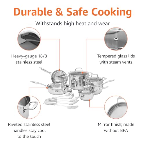 Amazon Basics Stainless Steel Cookware 15-Piece Set – Pots, Pans and Utensils