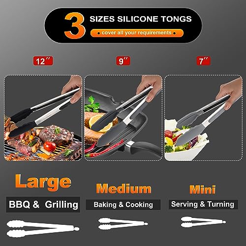 Anaeat Premium Non-Stick Silicone Locking Tong Set of 3 – Stainless Steel 7, 9 and 12 inch Kitchen Food Grippers with Non-Slip Silicone Tips for Cooking, Baking and BBQ – Heavy Duty & Heat Resistant
