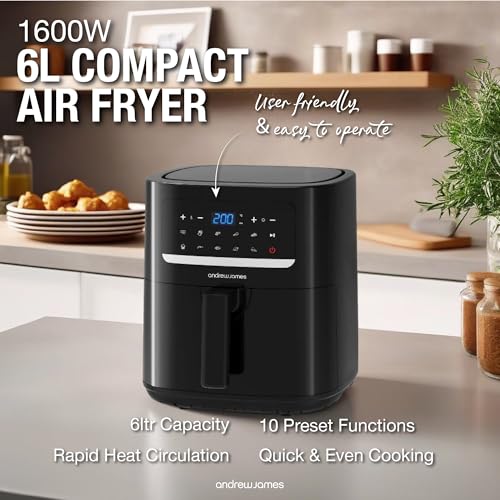 - THE HEALTHIEST WAY TO COOK MEALS: Our Andrew James 6l air fryer promotes healthy cooking by using hot air to achieve crispy textures with little to no oil, reducing fat and calorie content compared to traditional frying. This method also helps preserve nutrients in food, making meals both healthier and flavourful. 6 litre capacity is ideal for families and larger households – cook delicious meals quickly and energy-efficiently with our unique air circulation system ensuring an evenly cooked meal every time.