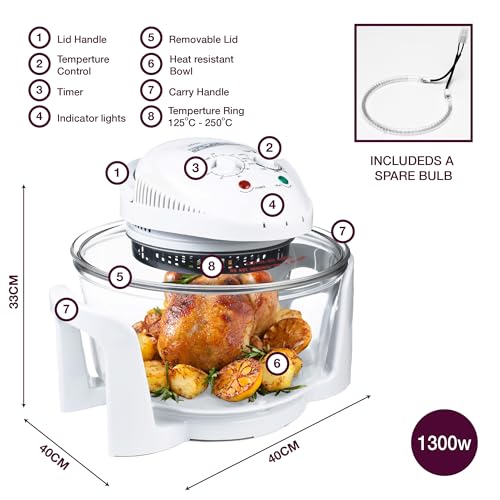 - HALOGEN OVEN WITH REPLACEMENT BULB – This halogen oven cooker not only comes with a 5-litre extender ring to increase the capacity of your halogen oven up to 17 litres. But it also includes 2 bulbs (both worth £12.99) Meaning that when the bulb eventually goes in your glass air fryer, you can simply replace the bulb, making your halogen oven cooker, last much longer.