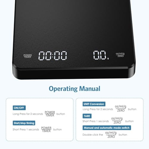 - 🍏Durable & Easy to Operate- This Drip Espresso Scale is made of high quality ABS scale surface and frame with high temperature resistant surface (135°C), which is both waterproof and durable, easy to clean and maintain. High sensitivity touch buttons, two sets of buttons are easy to understand and operate.