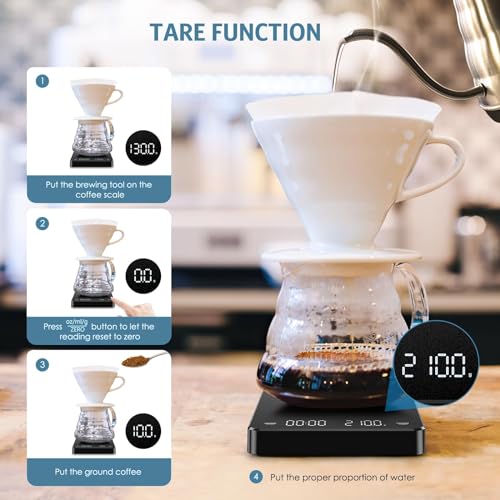 This coffee scale has 4 built-in high-precision load cells with 0.1g- 3Kg accuracy, more accurate weighing; timer accurate to 1s, timing up to 99 minutes 59 seconds, easy to control brewing time, when you do not need the timing function can also be a multi-functional kitchen scale!