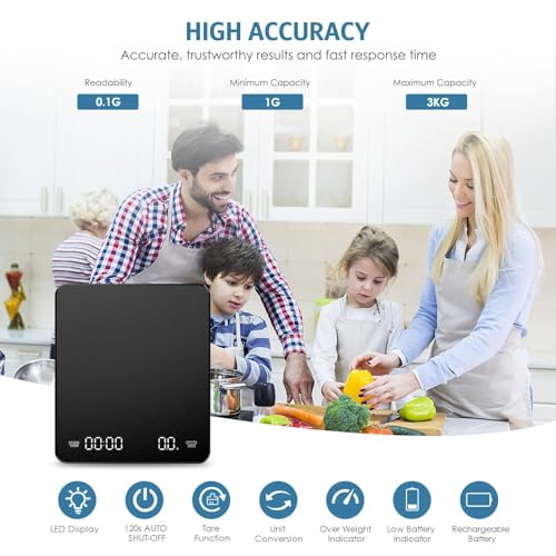 - ☕Super Accurate Measurement & Timing Function- This coffee scale has 4 built-in high-precision load cells with 0.1g- 3Kg accuracy, more accurate weighing; timer accurate to 1s, timing up to 99 minutes 59 seconds, easy to control brewing time, when you do not need the timing function can also be a multi-functional kitchen scale!