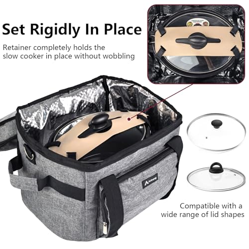 Arineng Double Layer Slow Cooker Carrier for 5-8 Quart Crock Pots – Insulated Travel Carrier with Fixators, Base Pad, and Shoulder Strap – Suitable for Small and Large Slow Cookers (Grey)