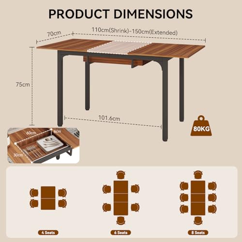 • EXTENDABLE DINING TABLE 4-6 SEATER: You can use the 110cm length table setting for daily use. When celebrating a holiday or inviting friends and family, you can easily switch the table to a 150cm length to accommodate up to 6 people. You can enjoy everything from light lunches to dinner parties by switching between two convenient seating arrangements.