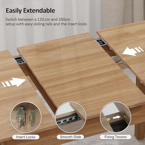 ARTETHYS Dining Table, 120-160cm Wood Extendable Table for 4-6 People, Large Kitchen Dinner Table with Solid Legs for Restaurant, Home