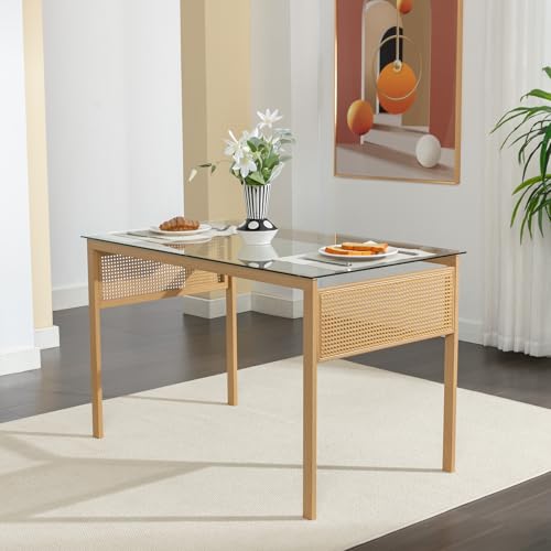 - Bohemian Elegance: Elevate your space with a Bohemian-style dining table. Its unique combination of glass, imitation wood grain metal legs, and rattan accents creates a stylish and inviting focal point for your dining area