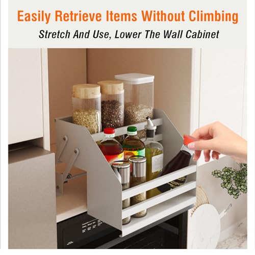 - Save space and increase convenience: We understand the challenges of limited kitchen space,which is why we designed this pull-down shelf to maximize space,so you can easily take items out of the cabinet,saving valuable time and energy. No more searching for spices or kitchen tools during busy cooking moments!