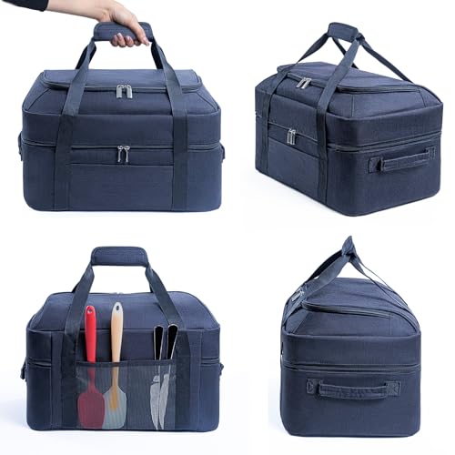 - DOUBLE LAYERS Design & Spacious- The main compartment fits the slow cooker well and comes with adjustable bands to keep the crok pot in place to avoid any drips/spills during transportation. The top layer is great for you to store your supplier utensils. Easy to load up a hot crok-pot for a potluck, church, parties, etc.