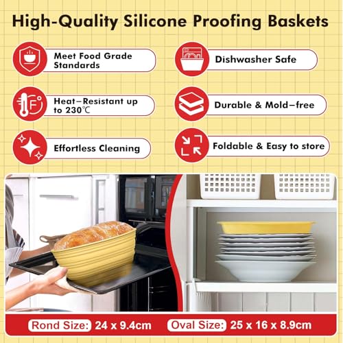 - 🍞【DURABLE BREAD PROOFING BASKETS 】:23cm Round and 25cm Oval Proofing Baskets are made of BPA-Free food grade silicone which can withstand temperatures up to 230℃. Compare to easy-mold rattan bannetons, TeeMars bread proofing baskets are smooth, no splinter and never to mold, safer for your family. Even more surprising is that it's foldable, easy to store and clean. Before putting the dough into silicone basket, please sprinkle a thin layer of flour on the basket to ensure less sticking issues.