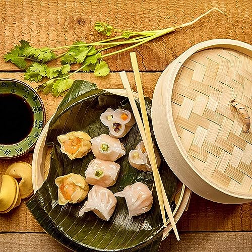 Bamboo Steamer 10 Inch, 2 Tiers Chinese Food Steamers, Traditional Design Healthy Cooking for Dumplings, Vegetables, Chicken, Fish – Handmade Steam Basket Included 2 Gauze Liners and Chopsticks