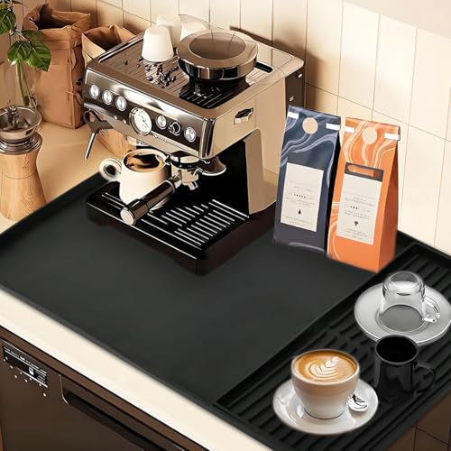 - 【Anti-Slip Silicone Material】The silicone coffee machine mat is made of high-quality silicone material, which is flexible and durable. The mat also features a strong, non-slip rubber backing for added safety and stability, it can hold your coffee maker, mugs and coffee maker accessories firmly in place to prevent accidental spills.