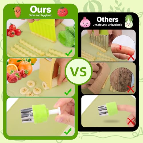 - Compact design: the cutting board of this montessori cooking set has a non-slip textured design and a handle for easy carrying, the plastic knife with blunt serrated edge prevents children from injury, and the smooth handle is designed to be comfortable and lightweight to hold. Can be used for potatoes, carrots, cucumbers