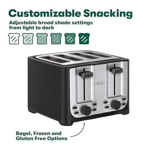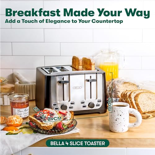 - FAMILY-FRIENDLY – Elevate your breakfast game with BELLA's new beautiful toaster. Boasting 4 spacious slots, it can accommodate an array of breads, muffins, and bagels simultaneously, making it an ideal choice for hectic mornings with your loved ones