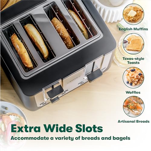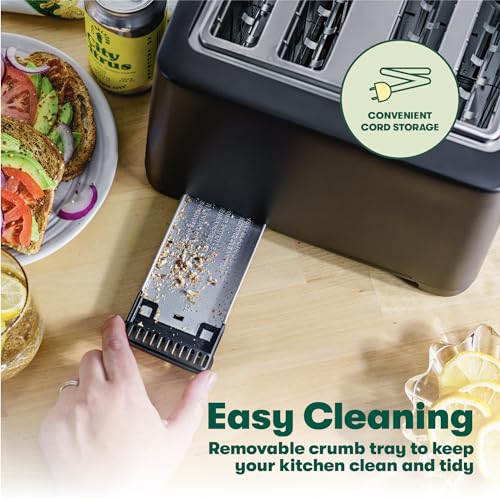 - NO MORE CLUTTER – Say goodbye to cluttered countertops with this 4 slot toaster, the greatest solution for a tidy and organized kitchen. Its slender profile and slick, versatile design make it easy to store, taking up minimal space on your countertop